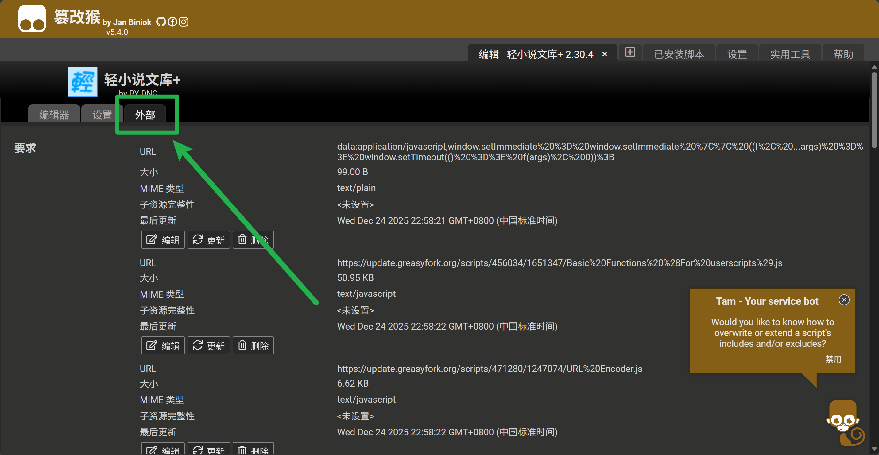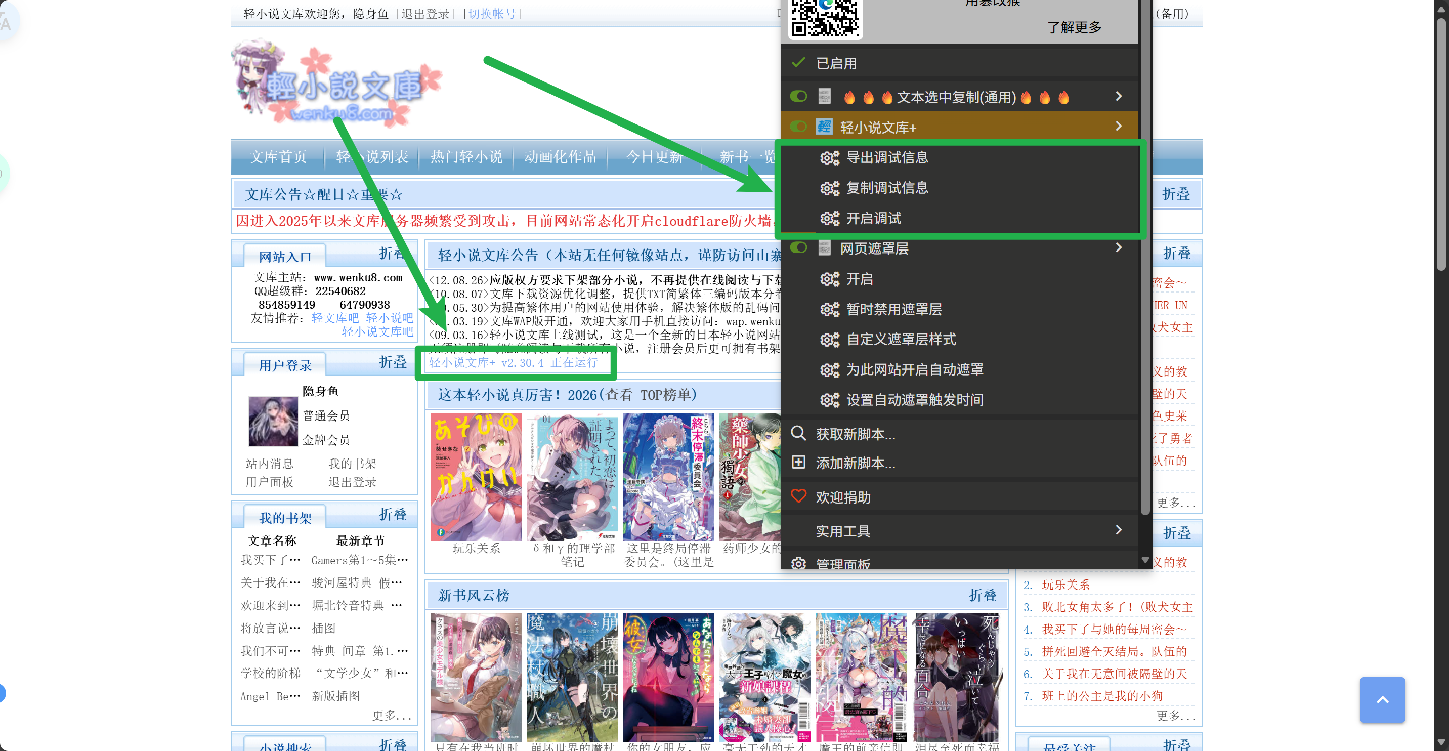 打开文库首页,检查是否能看到“轻小说文库公告”中的“轻小说文库+ v2.xx.x 正在运行”?如果不能看到,点开油猴的菜单,是否能看到“导出调试信息”等三个按钮?
